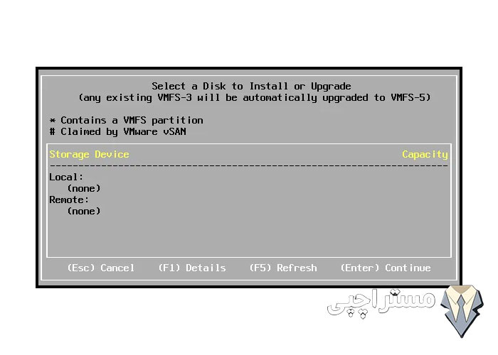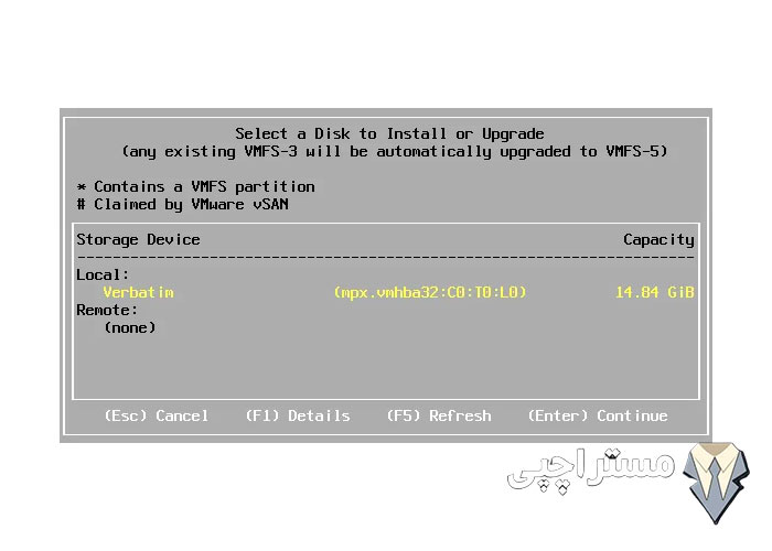هشدار حیاتی: دیسک فلش مموری یا SD Card هدف را با توجه به حجم کوچک آن با دقت شناسایی و انتخاب کنید. اگر از دیسک های RAID شده برای Datastore استفاده می کنید، مراقب باشید که آرایه RAID را انتخاب نکنید.